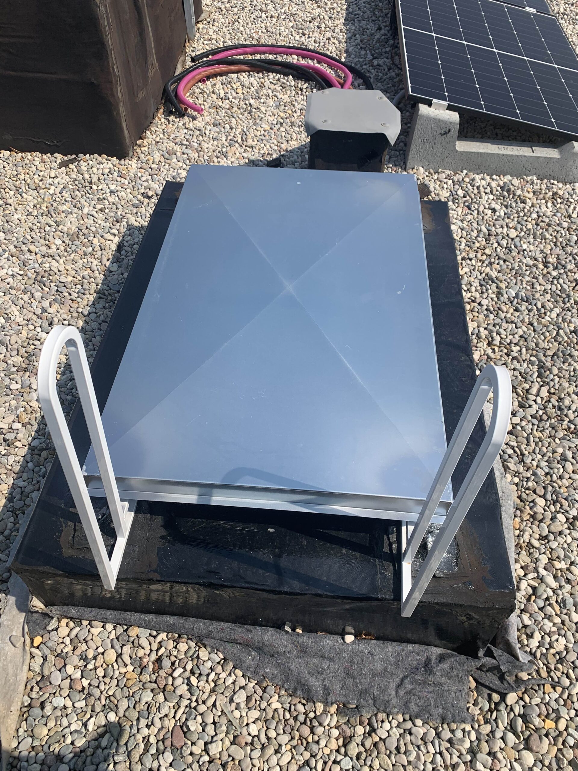 • coperchio superiore in multistrato di pioppo di prima scelta grezzo (non verniciato) spessore 15 mm, rivestito con una pellicola termoisolante e ricoperto in lamiera zincata a caldo (spessore 0,1 mm)