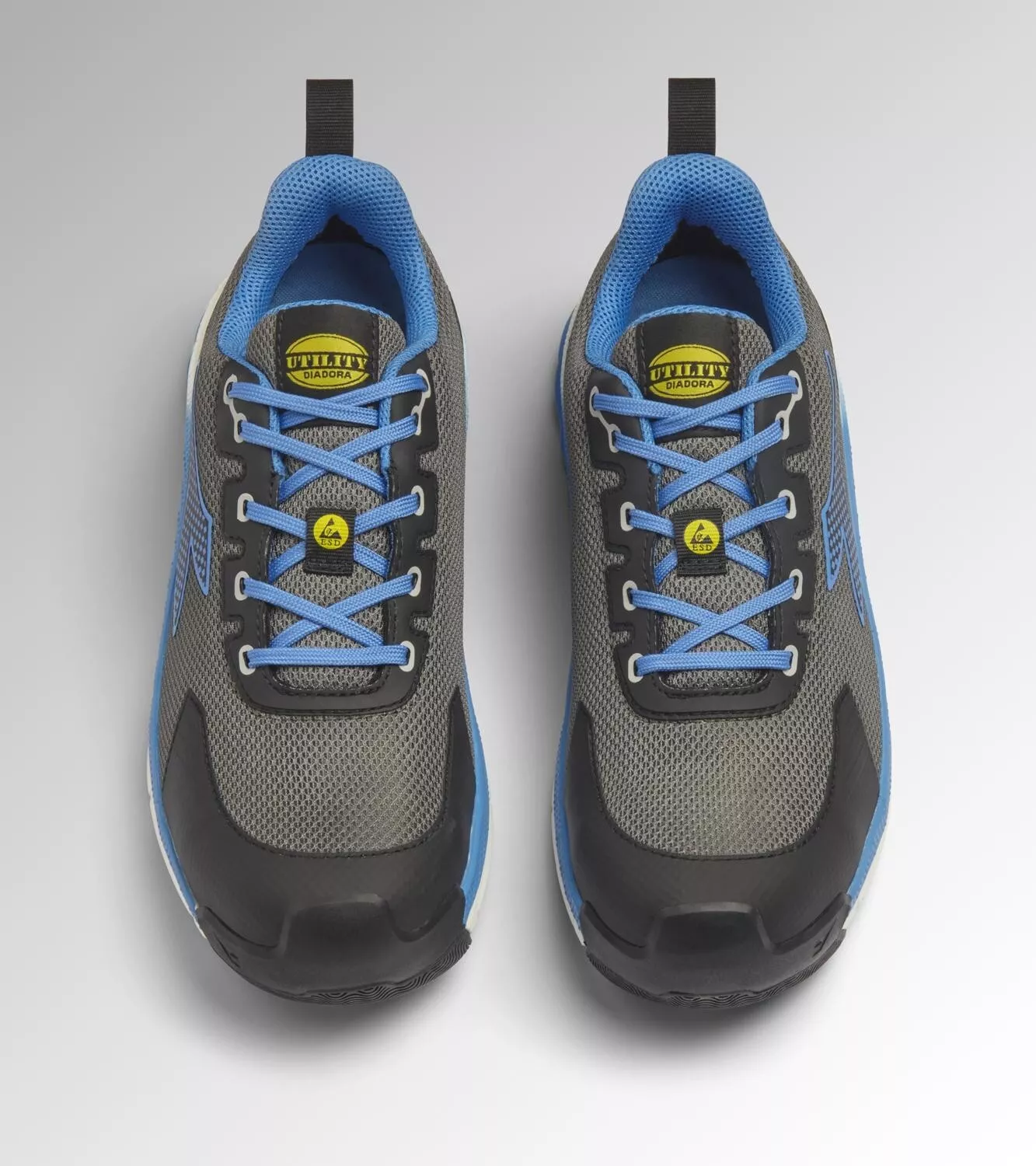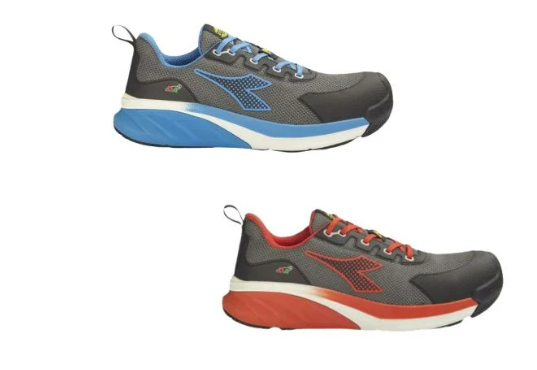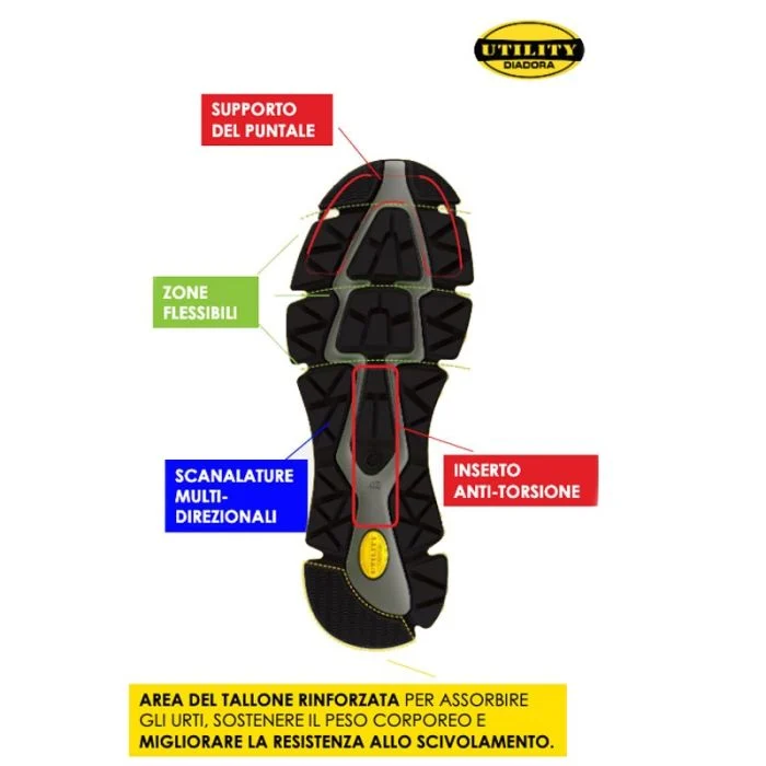 Scarpe Antinfortunistiche Basse Vortex DA2 Low firmate Diadora Utility, dotate di Tomaia in tessuto traspirante in Poliestere, Puntale in Alluminio con protezione fino a 200 J, Inserto antiperforazione K-SOLE, flessibile e ultra resistente, Suola con tecnologia Double Action, in EVA a doppia densità, per un perfetto assorbimento degli urti, rinforzi in poliuretano 3D Printing su punta e tallone per maggiore durabilità, Fodera in mesh 3D alveolare con inserto anti-scalzamento in microfibra, soletta microforata e removibile in schiuma PU a cellule aperte, traspirante con carboni attivi, Suola in gomma nitrilica resistente al calore da contatto e agli agenti esterni. Normative: S1PS, SR, HRO, ESD.
